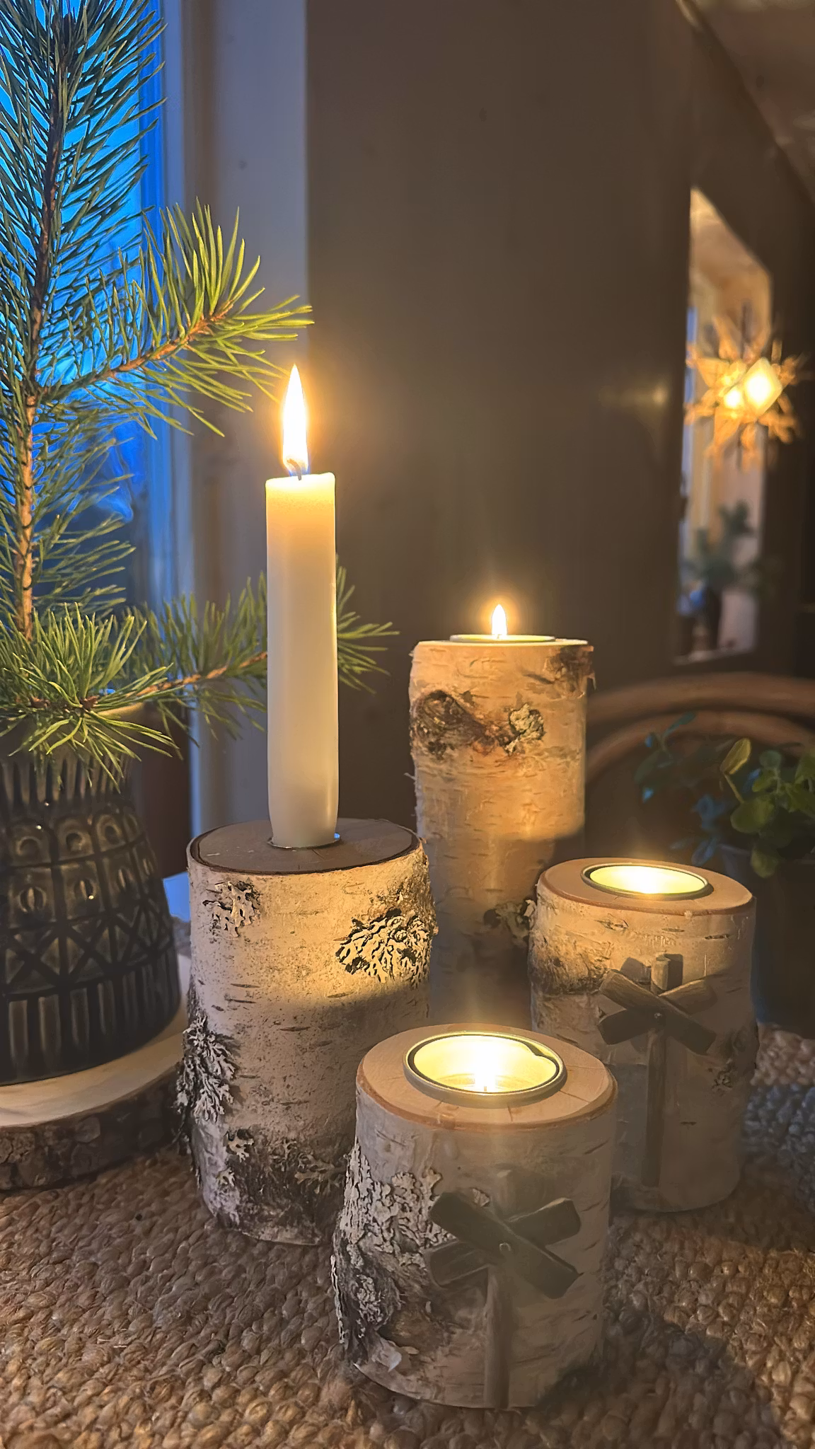 Värmeljushållare i jämtländsk björk med metallhållare nedsänkt i träet för att hålla värmeljuset på plats.