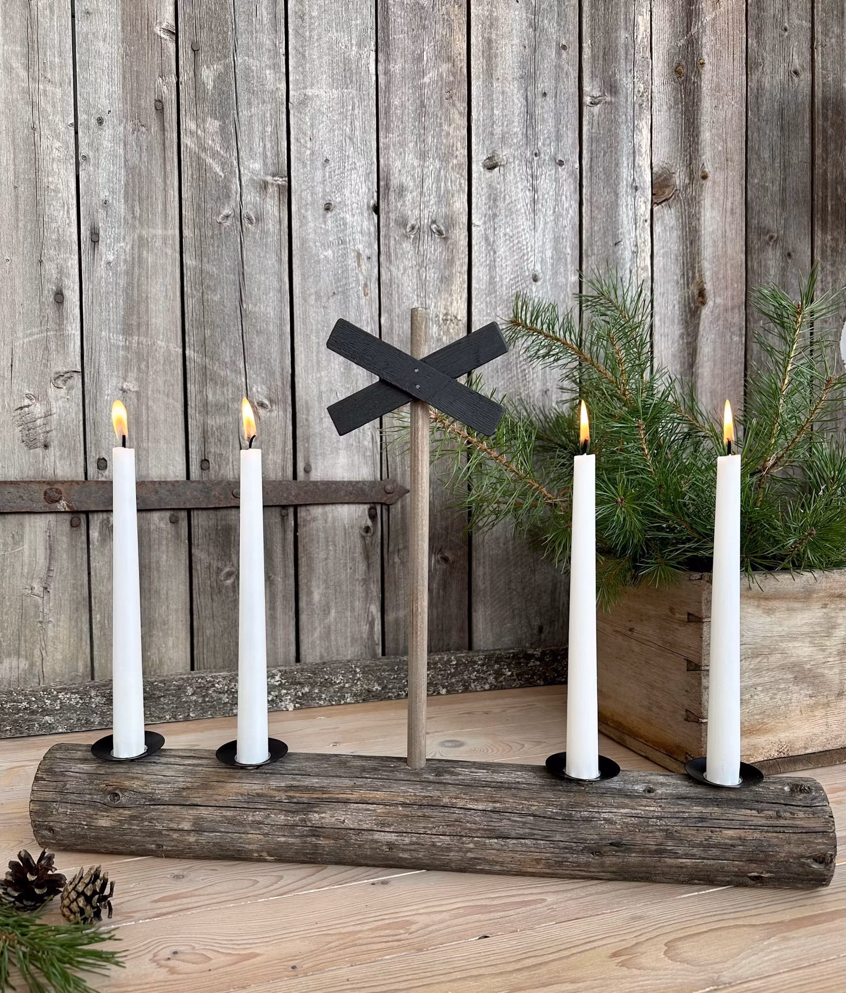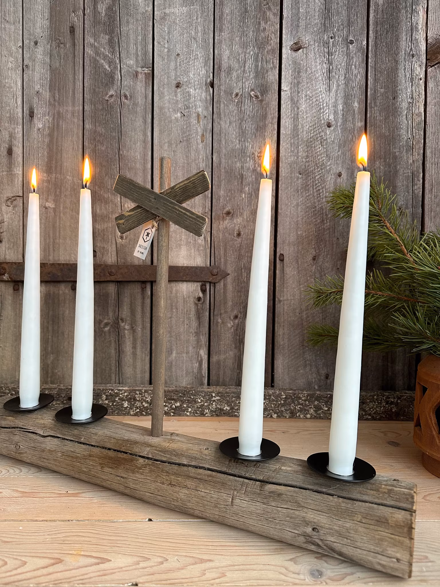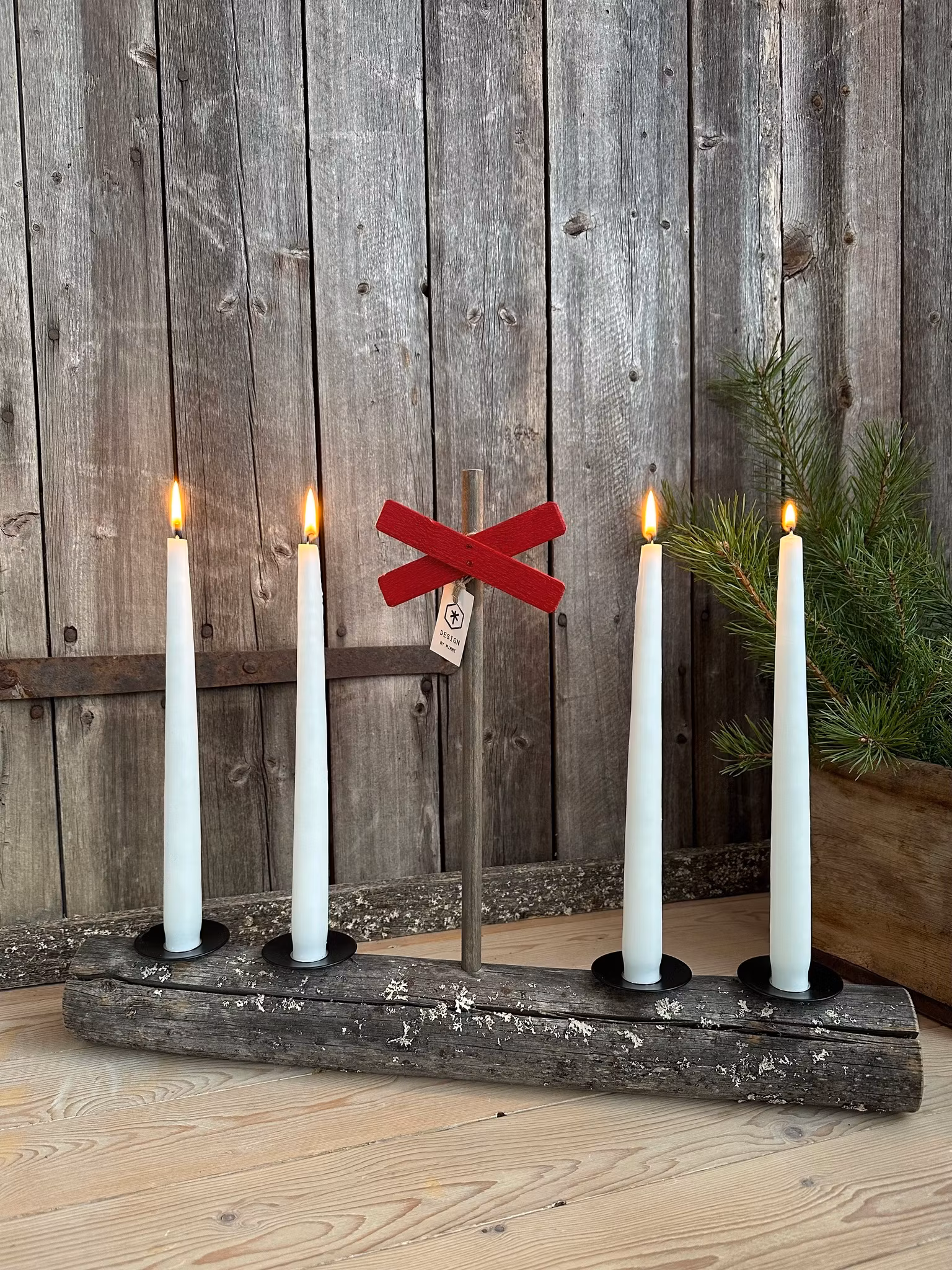 En fjällinspirerad adventsljusstake som är tillverkad av jämtländskt torrfura eller flytved från fjällvattnet i Dammån.