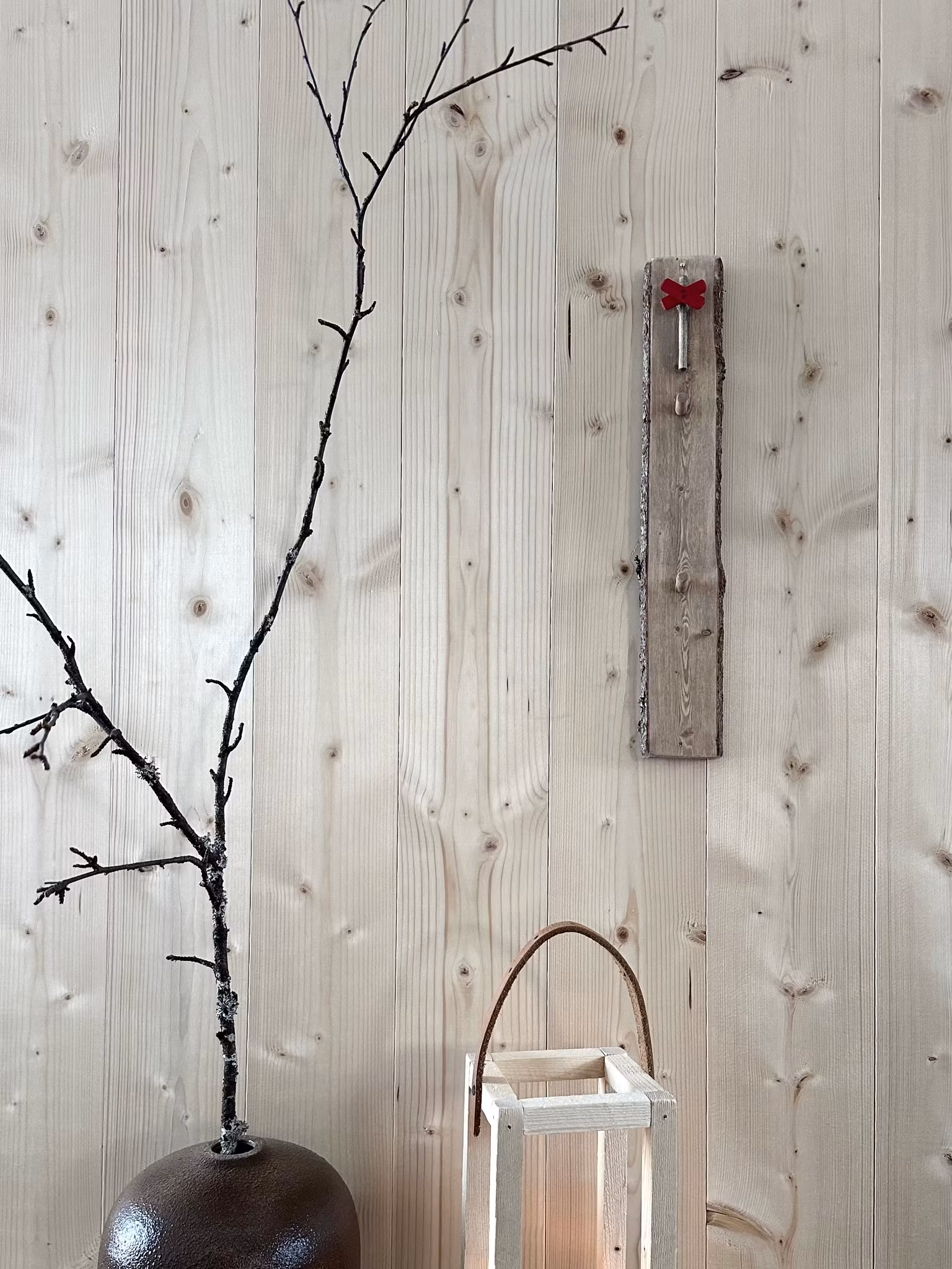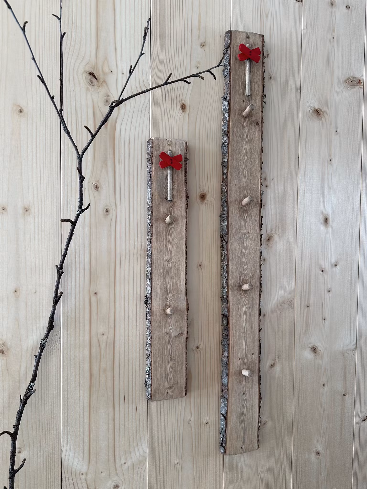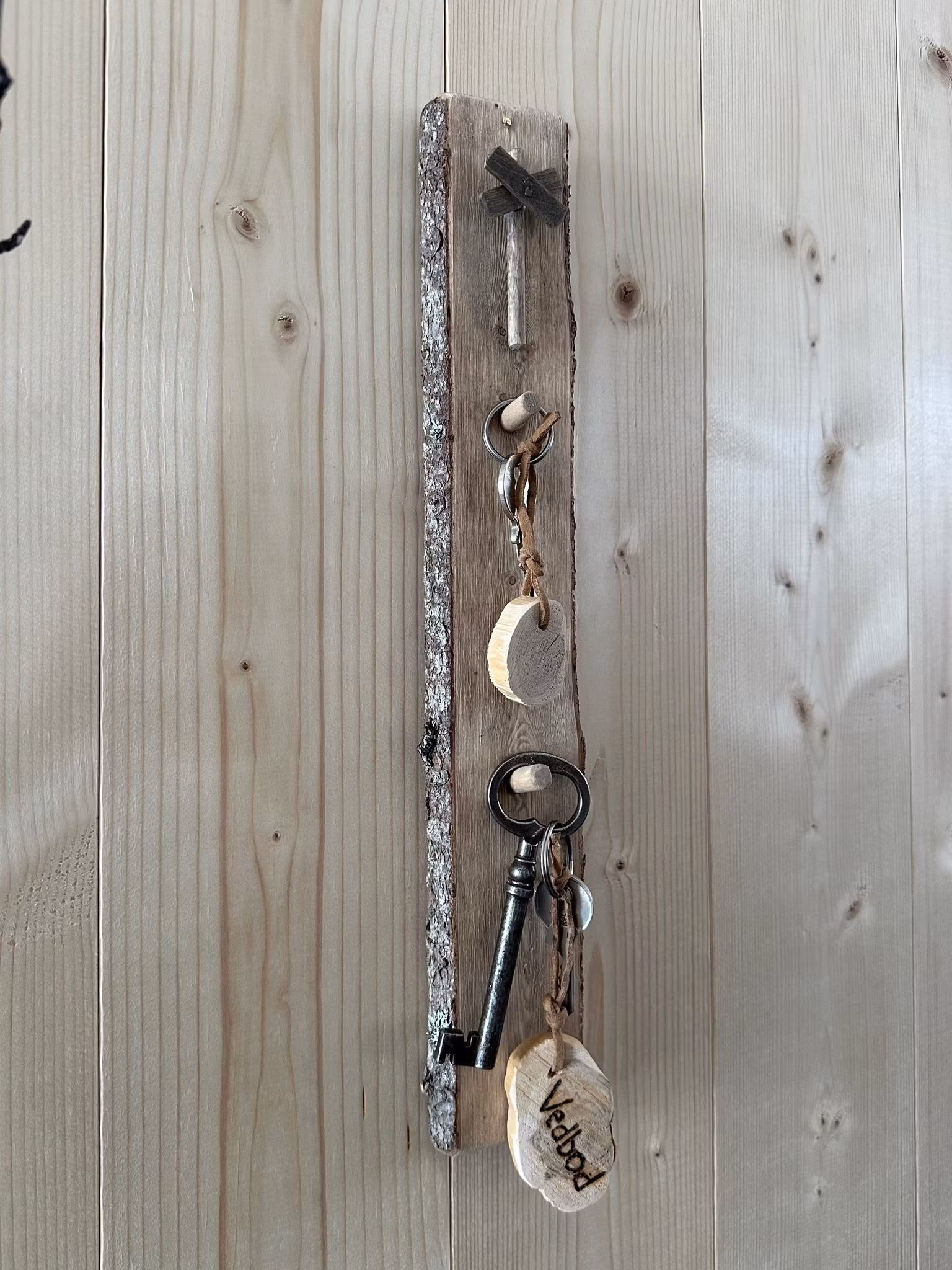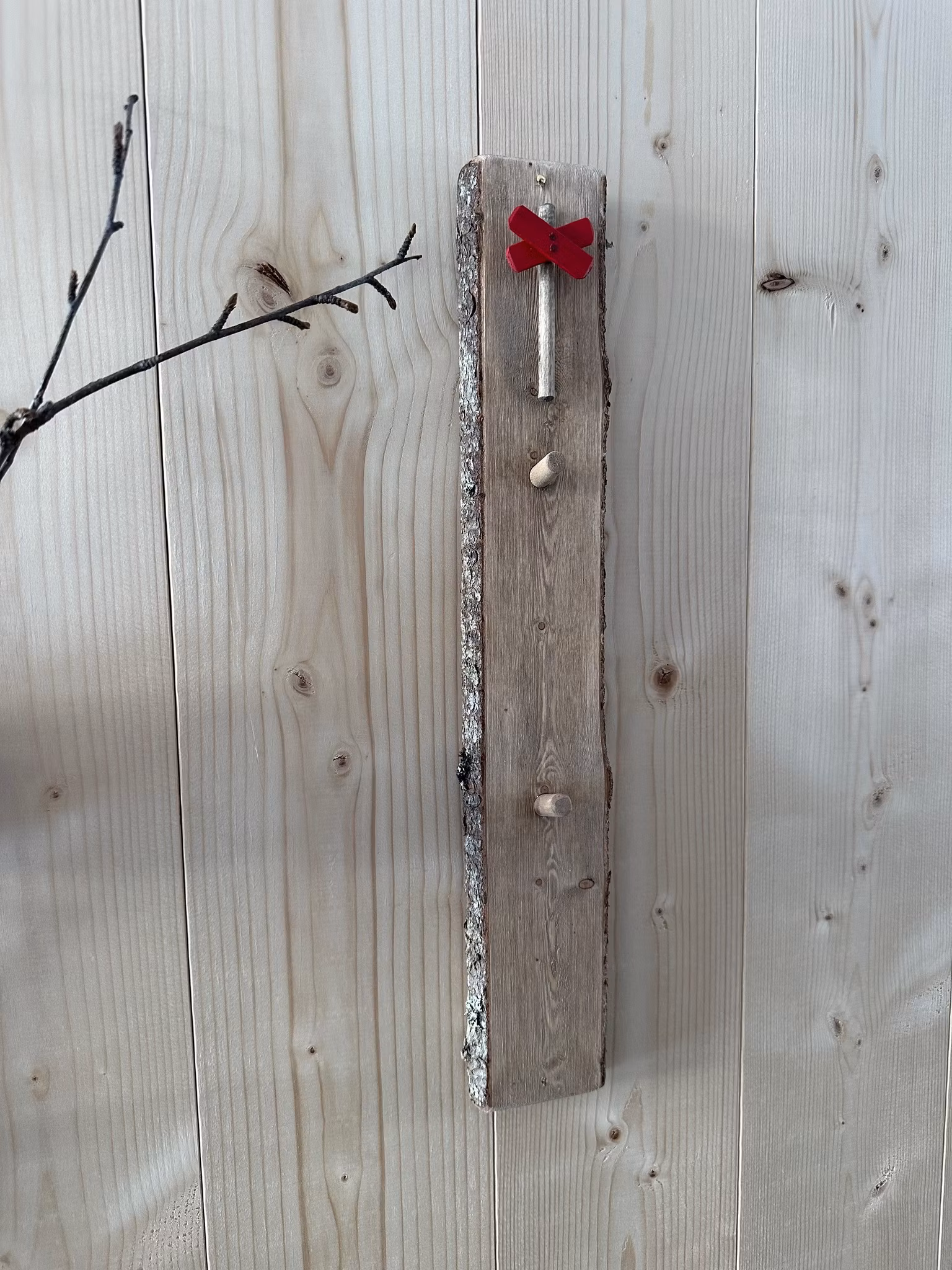 Nyckelbräda tillverkad av gran med 2 krokar och ett ledkryss i trä.